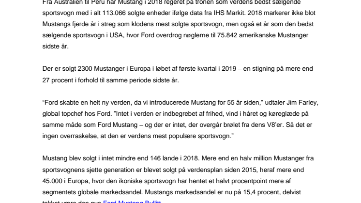 Fra Australien til Peru har Mustang i 2018 regeret på tronen som verdens bedst sælgende sportsvogn med i alt 113.066 solgte enheder ifølge data fra IHS Markit. 2018 markerer ikke blot Mustangs fjerde år i streg som klodens mest solgte sportsvogn, men også et år som den bedst sælgende sportsvogn i USA, hvor Ford overdrog nøglerne til 75.842 amerikanske Mustanger sidste år.