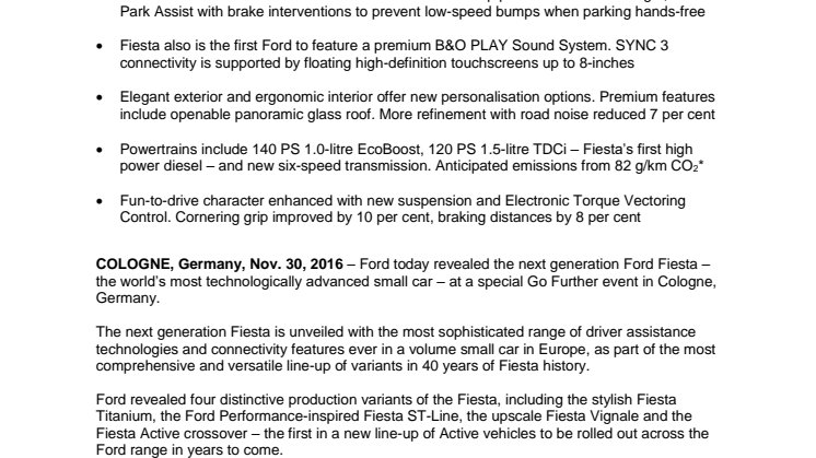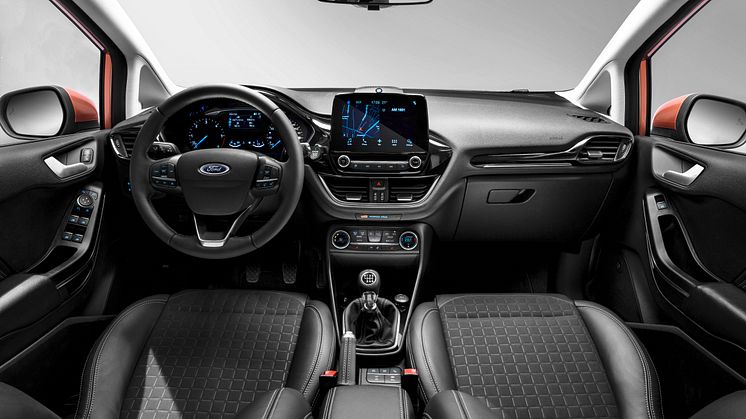 Den nye Fiesta introducerer usædvanligt sikkerhedsudstyr og med SYNC 3 med 8” touchscreen det mest moderne infotainmentsystem i klassen. Kunderne vil på samme måde opleve klassens mest moderne og stærkeste motorer – Fords prisbelønnede trecylindrede EcoBoost-motor med ydelser helt op til 140 hk og den nye 1,5-liters TDCi-motor med 120 hk med en ydelse højere end nogen tidligere dieselmotor i Fiesta.