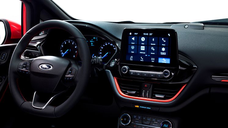 Det nye infotainmentsystem SYNC 3 med 8” touchscreen er fra starten tænkt ind i instrumentpanelets linjer, hvilket integrerer det naturligt i designet. Fords nye infotainmentsystem giver mulighed for at styre lyd, navigation og en tilsluttet smartphone med simple kommandoer, som fx ”jeg mangler benzin”, og så er den nye Fiesta den første model, der nyder godt af det eksklusive B&O Play-lydsystem, som er udviklet i samarbejde med HARMAN – det er perfekt afstemt netop til Fiesta og inkluderer bl.a. 10 højttalere, subwoofer og 675 watt forstærker. Udover SYNC 3 med 8” touchscreen fås også en elegant 6,5” touchscreen og en udgave med 4,2” skærm kombineret med MyFord Dock.