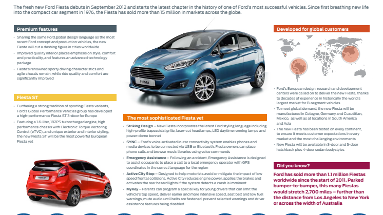 Ford Fiesta er netop tildelt de maksimale fem stjerner i Euro NCAP crash test. Den nye Ford Fiesta scorede 83 procent i generel sikkerhed, 91 procent for fører og forsædepassager og 86 procent for børnesikring. Mere end 50 procent af Fiestaen er konstrueret i specielt højstyrke-stål, hvilket er medvirkende årsag til det gode resultat i Euro NCAP’s crash-tests med de maksimale fem stjerner.